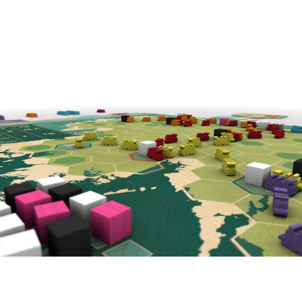 On each player’s turn, they can either place a share of one of five companies up for auction, build track (represented by cubes) in one of these five companies, upgrade a town to a city, or call for dividends. The dividends are paid out to shareholders of certain railroads based on how many cities/towns they connect to and how many shares of this company have been issued. The upgrade and dividend actions also affect game length and the likelihood of further dividends for each company. The game ends when a certain condition is met at the end of a player’s turn, and the player with the highest sum of money and stock value at the end of this turn wins.
