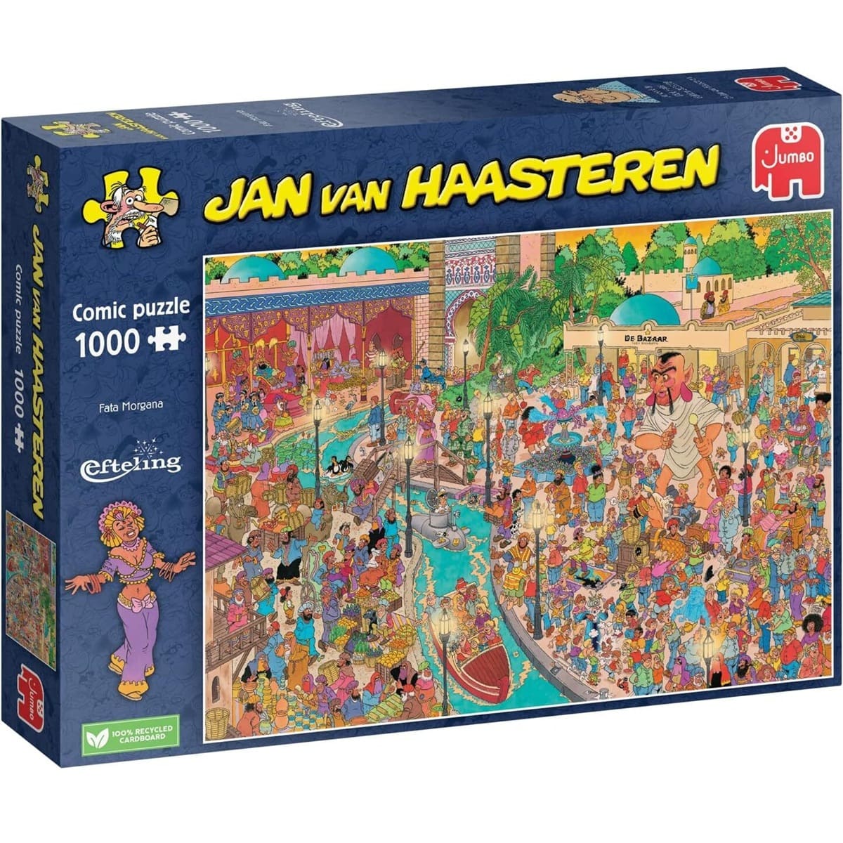 A Scene Rich with Color, Detail & Hidden Humor—Jan van Haasteren is renowned for his lively, detailed illustrations that burst with bright colors and comedic scenes. This puzzle depicts a busy square with the Jan van Haasteren family exploring the Fata Morgana boat ride, with familiar faces, the Djin, and other whimsical characters. Watch out for the crocodile lurking in the scene!