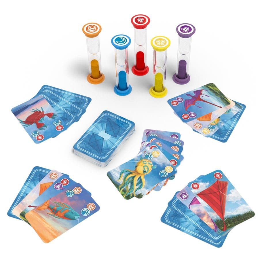 In Kites, everyone works together to keep all their kites — represented by colorful sand timers — in the air. Take turns playing cards, flipping the sand timers, and coordinating with other players to ensure none of the timers run out. If it does, a kite has crashed! Add complication cards for additional challenges.