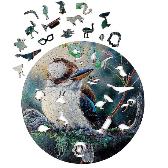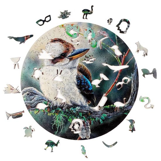 This piece is an original artwork piece created by Natalie Jane Parker called “A winters morning – The Laughing Kookaburra” We loved how we were able to adapt the piece to form a circular puzzle that still encapsulated the beauty of the kookaburra up close and in its natural setting.