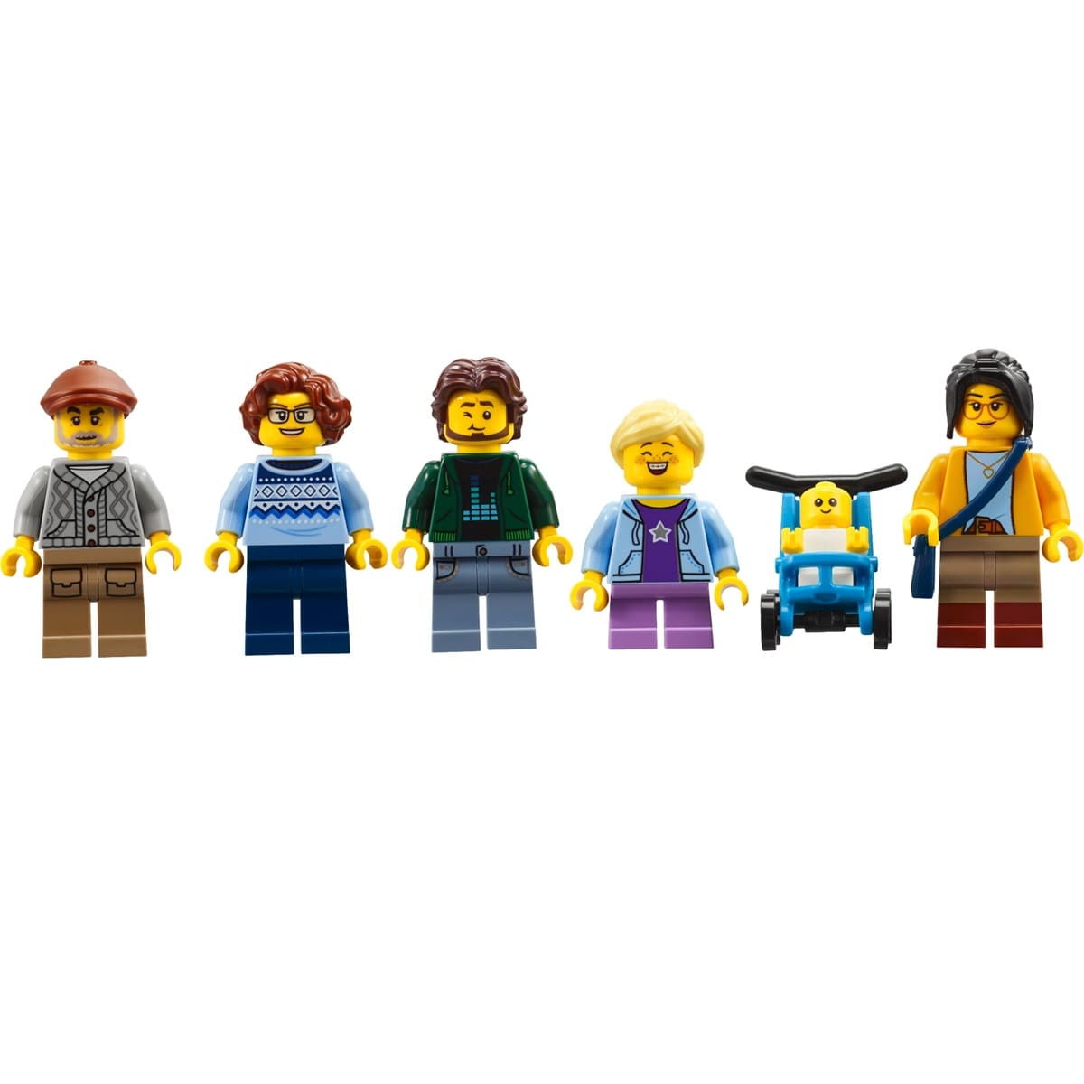 This set comes with six minifigures — the shopkeepers and a visiting family of four — plus four animals: two birds, a cat, and Squirvels the squirrel, adding life and personality to the scene.