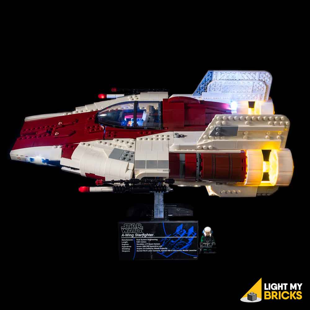 With 1,673 pieces and display worthy detail, Light My Bricks have brought light speed capabilities to this model with a custom light kit fitted with 16 individual lights, including special large size bit lights for the rear engines + pulsing effects, and firing gun effects for the side cannons.
