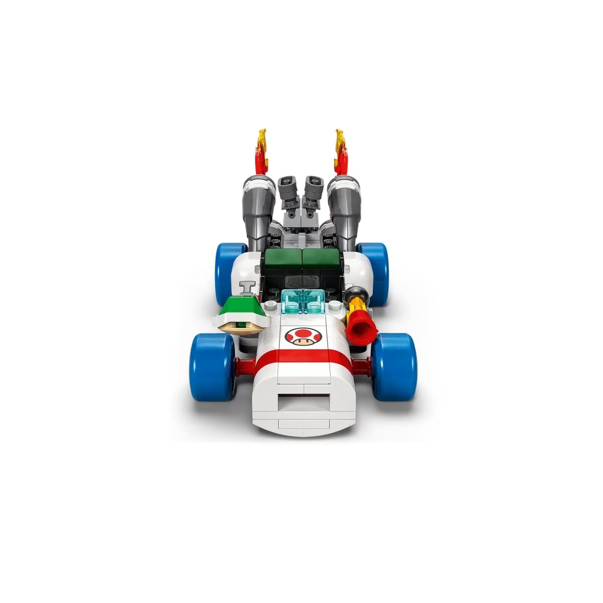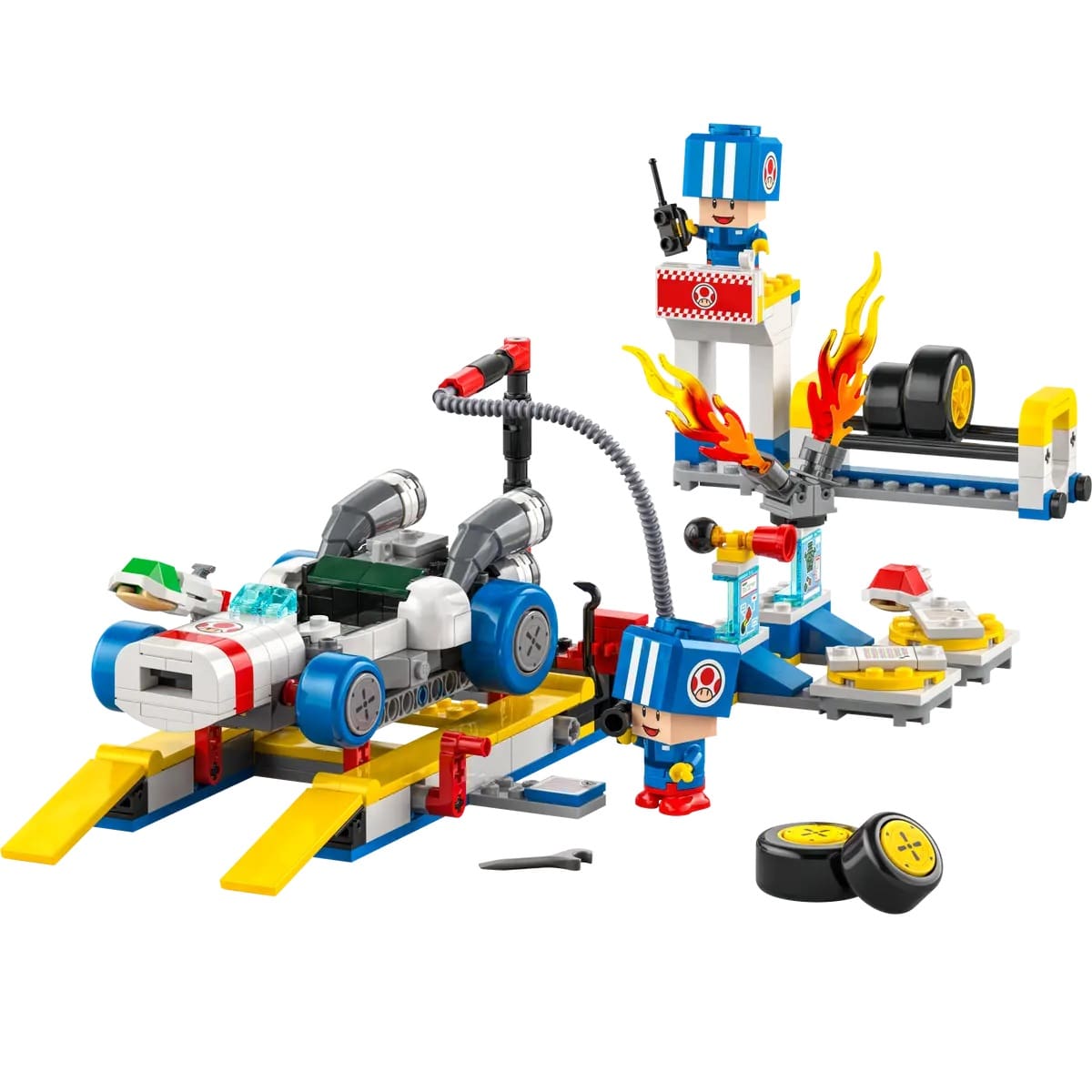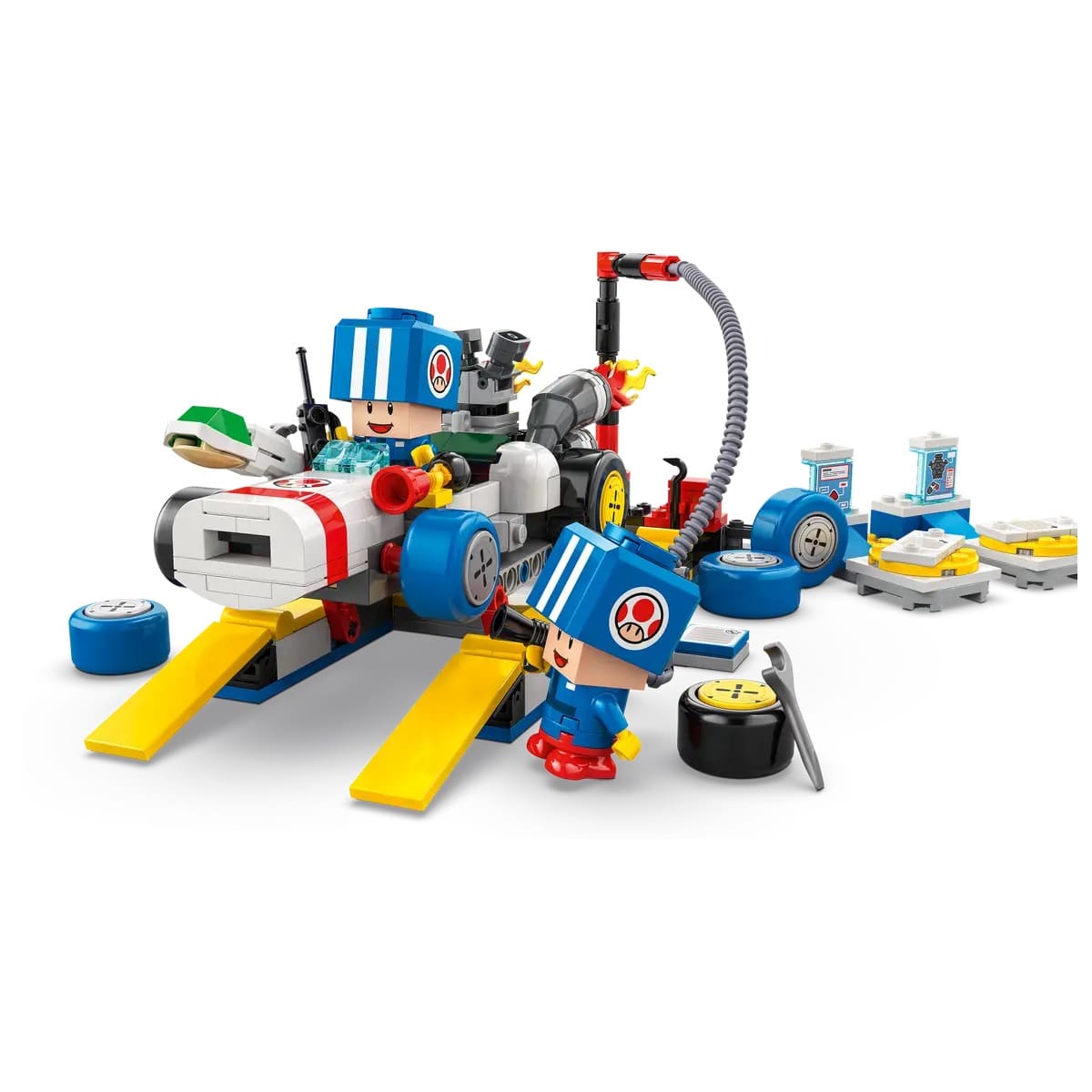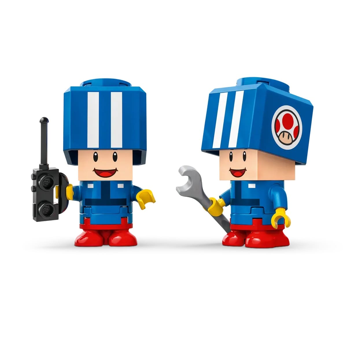 - 2 Nintendo® collectible Blue Toad (Pit Crew) toy figures – This LEGO® brick-built Mario Kart™ set features 2 Blue Toad (Pit Crew) figures in blue pit crew uniform, plus assorted accessories