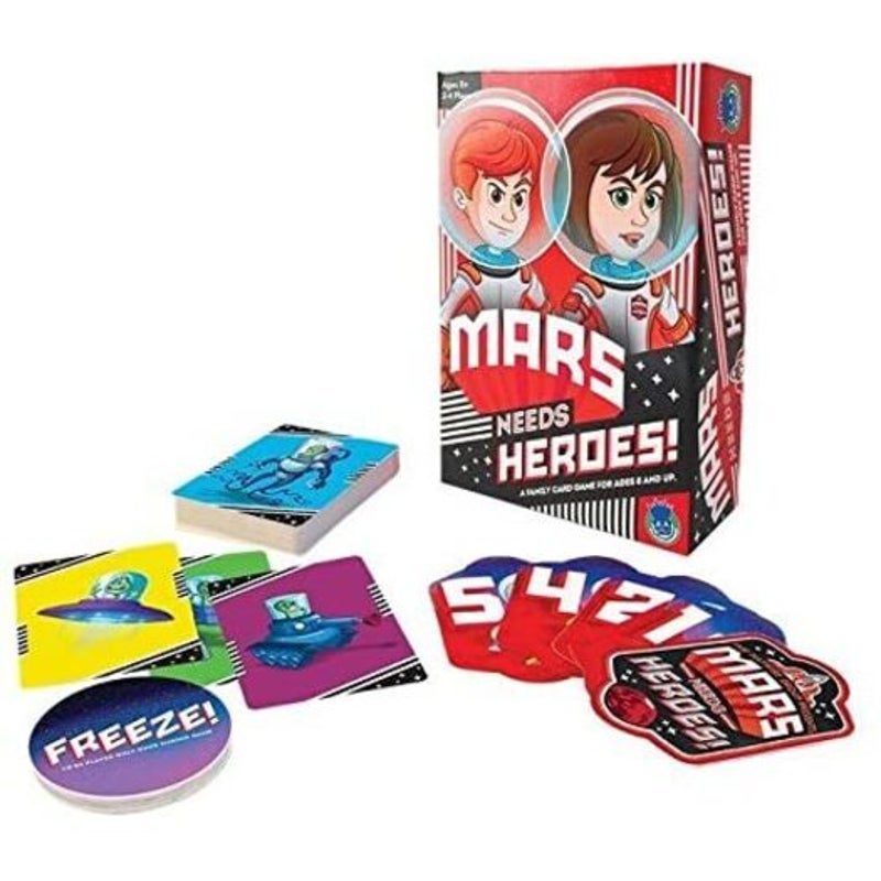 Transmitting live from Mars, a distress beacon beams directly to Earth: Mars Needs Heroes! The peaceful colony on the red planet is under siege from intergalactic invaders intent on taking control. Use your team of allies (the Bot, the Doc, the Tech, and your two Squad Leaders) or employ the powerful freeze ray to outplay other teams and capture as many evildoers as you can. Whoever traps the most invader cards is the ultimate hero!