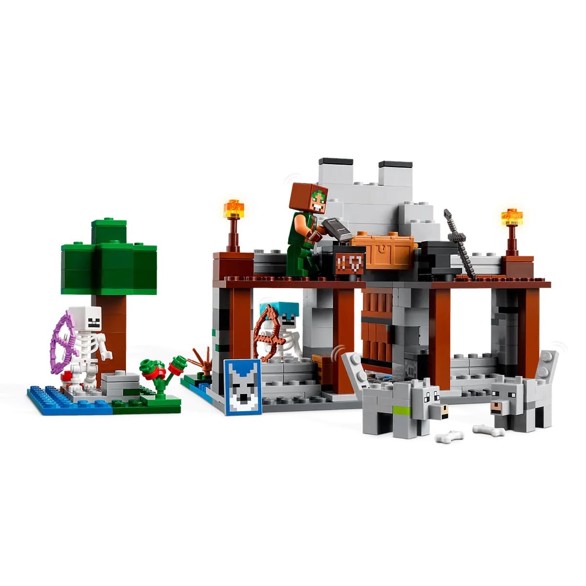 Kids build the Wolf Tamer a base featuring a big wolf’s head above the entrance, then have fun switching the wolf’s face from friendly to angry. Inside is a crafting table, blast furnace , anvil and, for the first time in a LEGO Minecraft set, a smithing table. A chest of supplies contains a Netherite ingot, which kids can craft into a sword, sweet berries, and bones that are used to tame the wild wolf. Outside is a forest sectionwith a tree, boulder, mushroom and sweet berry bush. 2 Minecraft skeleton toys wander the forest: one has an enchanted bow, the other has a bow and arrow and diamond helmet. For added digital fun, builders can use the intuitive LEGO Builder app.