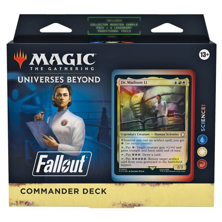 Battle your fellow wastelanders for survival as the Fallout series joins with Magic’s most popular multiplayer format. This bundle includes all 4 Fallout Commander Decks – 1 Hail Caesar (Red-White-Black deck), 1 Scrappy Survivors (Red-Green-White deck), 1 Science! (Blue-White-Red deck), and 1 Mutant Menace (Black-Green-Blue deck). Each deck set includes 1 ready-to-play deck of 100 Magic cards (2 Traditional Foil Legendary cards, 98 nonfoil cards), a Collector Booster Sample Pack (contains 2 Traditional Foil or nonfoil special treatment cards, with 1 Extended-Art card of rarity Rare or higher and 1 alt-art, alt-frame card of rarity Uncommon or higher), 1 foil-etched Display Commander (a thick cardstock copy of the commander card with foil etched into the card’s border and art), 10 double-sided tokens, 1 deck box (can hold 100 sleeved cards), 1 Life Wheel, 1 strategy insert, and 1 reference card.
