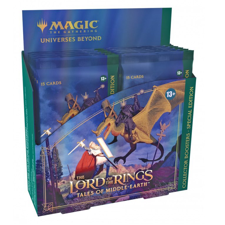 This The Lord of the Rings: Tales of Middle-earth™ Special Edition Collector Booster Box contains 12 Special Edition Collector Boosters. Each booster contains 15 cards, including 5 cards of rarity Rare or higher and 5 Uncommon, 4 Common, and 1 Land cards.
