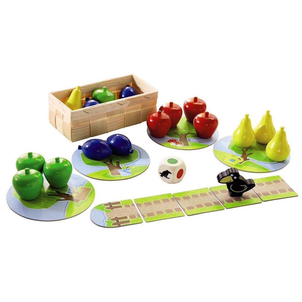 Game includes 10 wooden apples, 10 wooden Paris of cherries, 10 wooden plums, 1 raven, 4 fruit baskets, 1 raven jigsaw 9 pieces, 1 colour symbol die and instructions.
