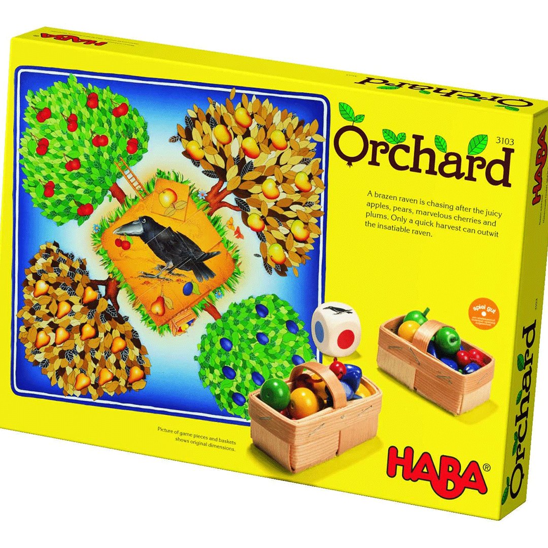 The Orchard Game from HABA celebrated 30 years in 2016 and has sold over 3 million copies worldwide! Red cherries, yellow pears, blue plums and green apples hang from the trees in the orchard. The bold raven wants the delicious fruit too. The players must harvest the fruit quickly before the raven can grab it. A simple entry level game for children, where each player rolls the die to see which fruit they may harvest with the baskets. Watch out though. if the raven is rolled, one more piece of the raven puzzle is built in the centre! A great family cooperative game as everyone works together to collect the fruit before the raven puzzle is complete!