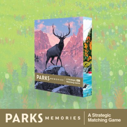 PARKS Memories is a strategic matching game for two or more players offering simple and flexible gameplay. Parks are represented in tiles laid out in a grid across the table face down. Gameplay includes four simple steps: reveal two tiles; choose one of the revealed tiles and place it in front of you; add a new tile to the board; lock one of the tiles with the hiker token. Gameplay passes from person to person until one player or team has collected three sets of matching park tiles in front of them.