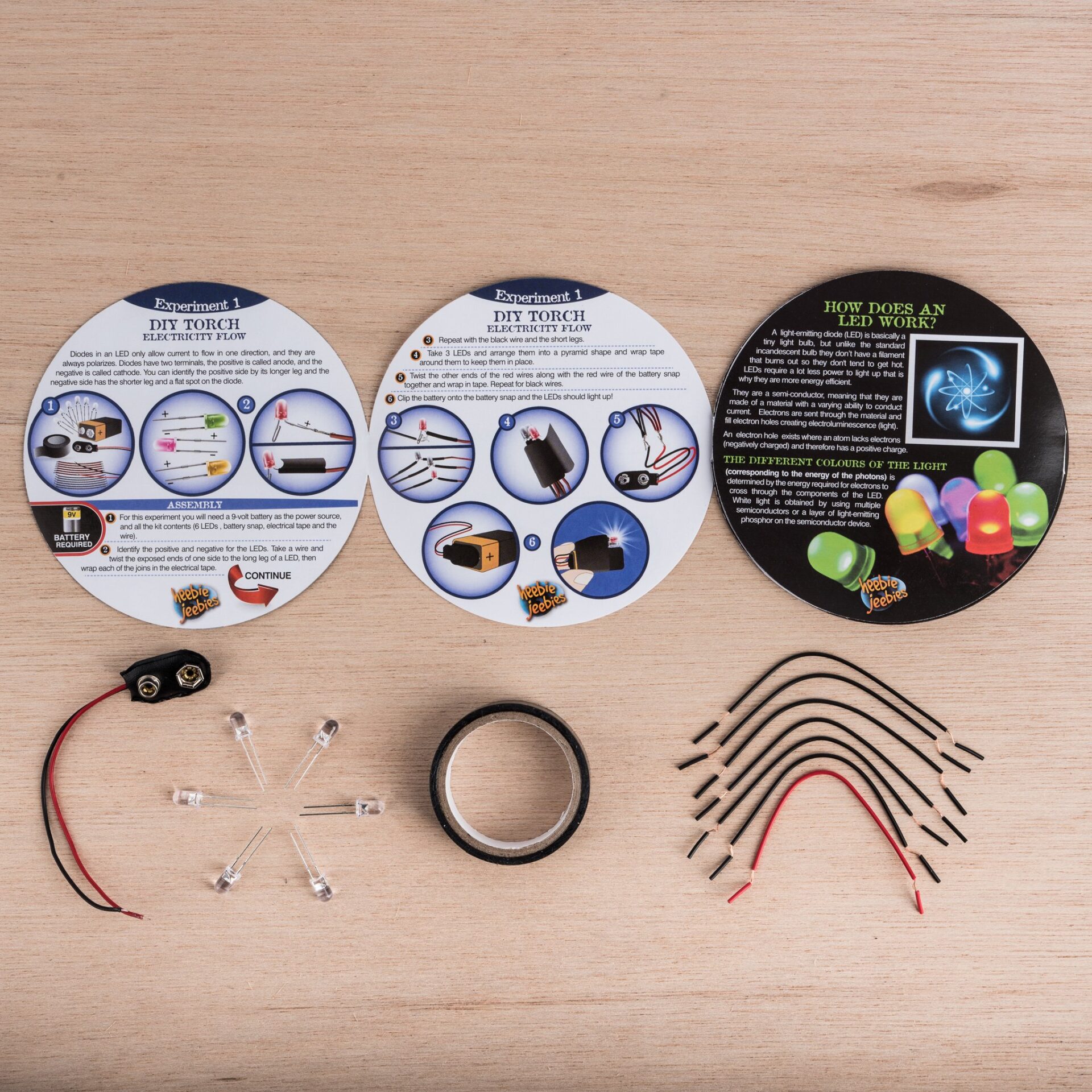 All kits include a roll of electrical tape, 5 LEDS, 7 lengths of pre-cut wire, battery snap, and instructions. 9v battery not included.