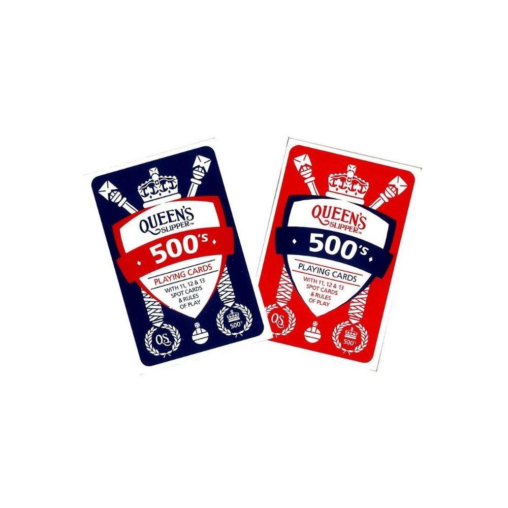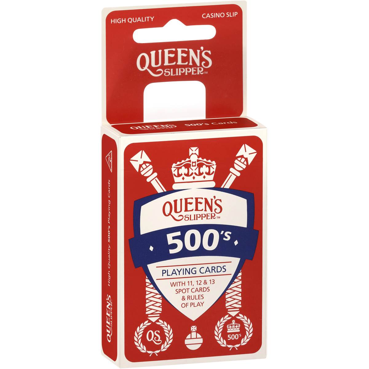 Come up trumps with Queen’s Slipper 500’s. In addition to the standard 52 cards, the 500’s deck includes Elevens and Twelves in each suit, 2 Thirteens in the red suits, plus a Joker. Cards measure 52x89mm in size and each deck includes the rules of play.