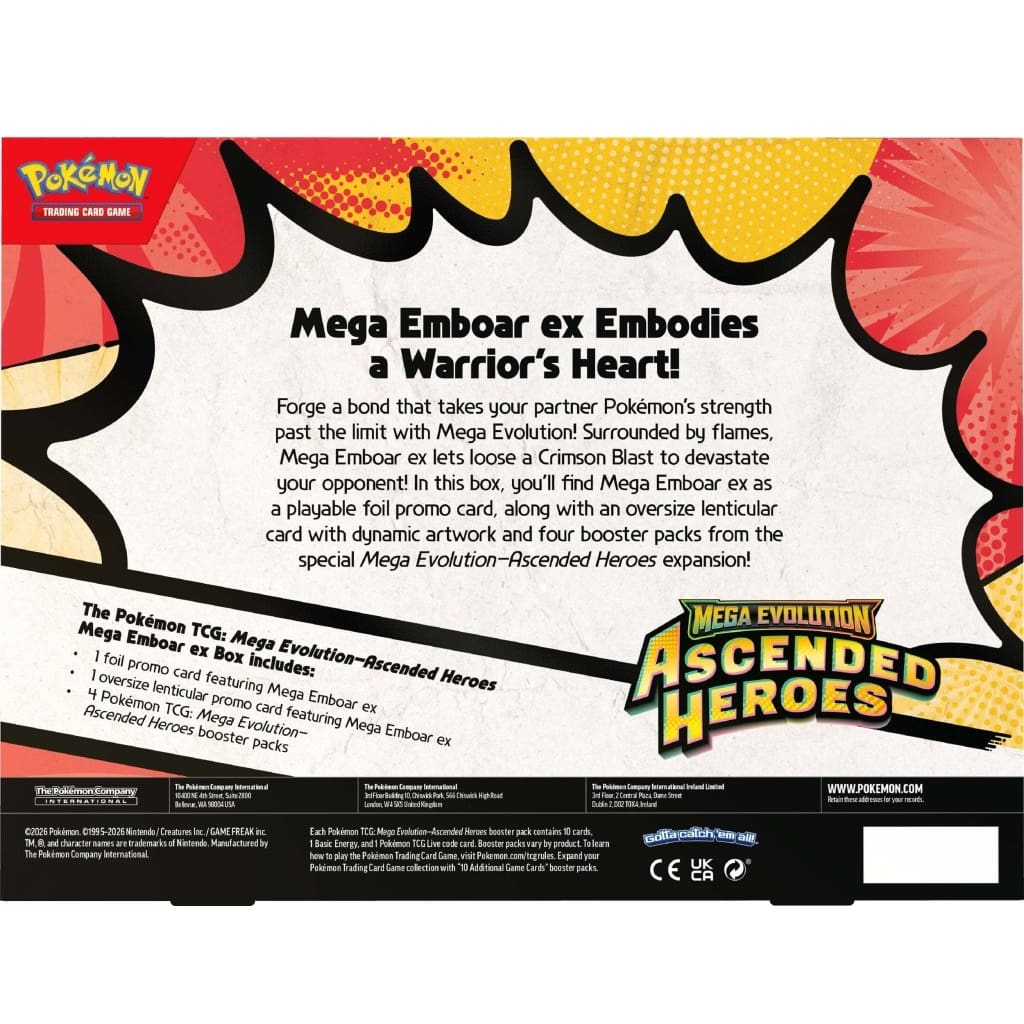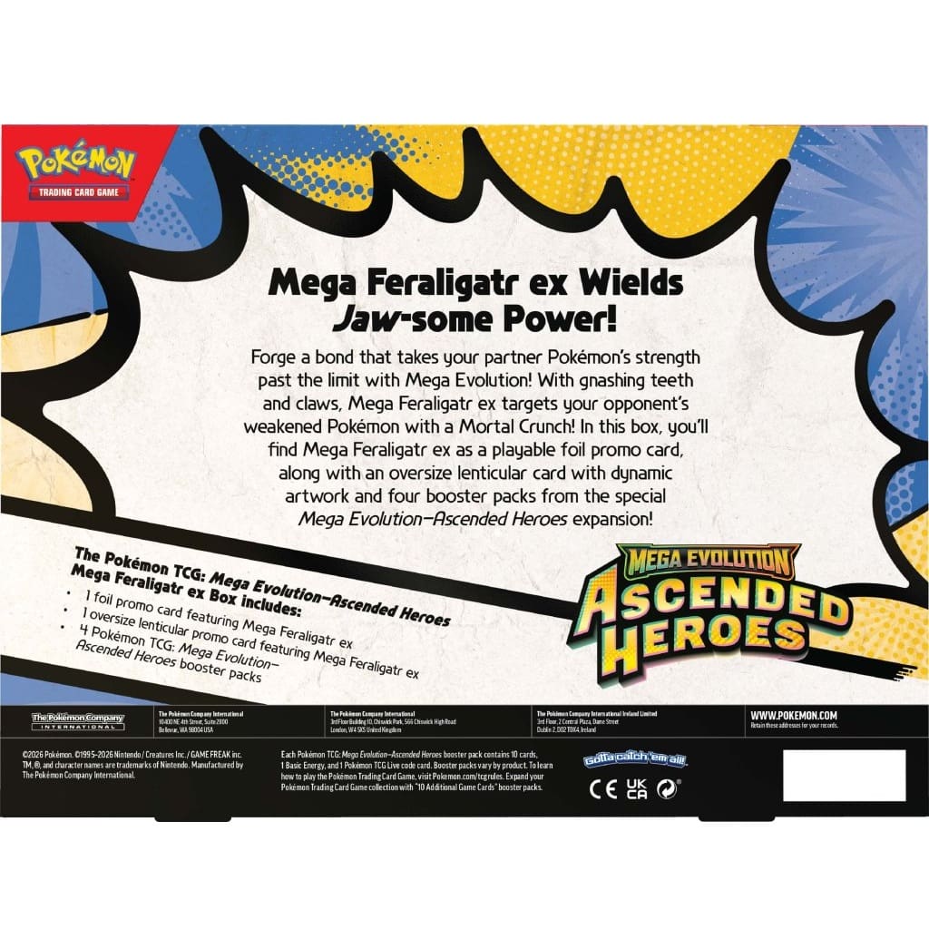 Take your partner Pokémon beyond their limits with Mega Evolution! Each box features a playable foil promo card of Mega Meganium ex, Mega Emboar ex, or Mega Feraligatr ex, plus an oversize lenticular card with dynamic artwork and four booster packs from the special Mega Evolution—Ascended Heroes expansion.