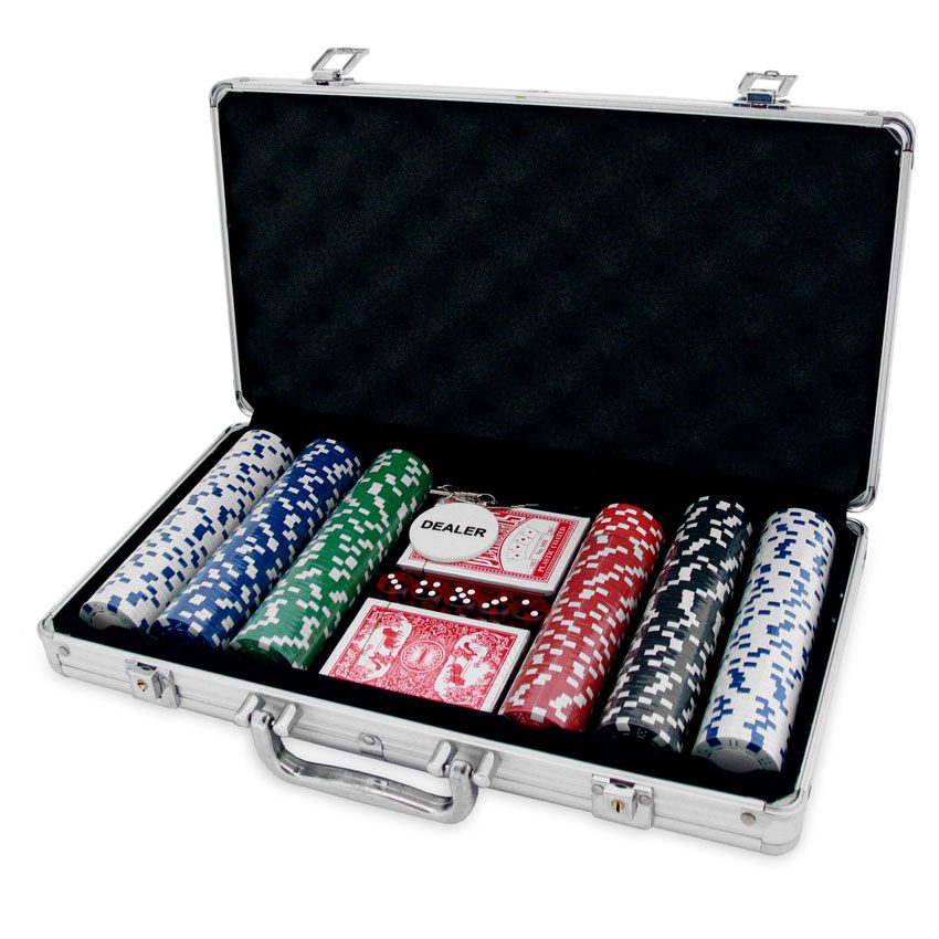 300 Heavy Weight Poker Chips, 2 Decks of Cards, 5 Casino Dice and a Dealers Button in a metal carry case.