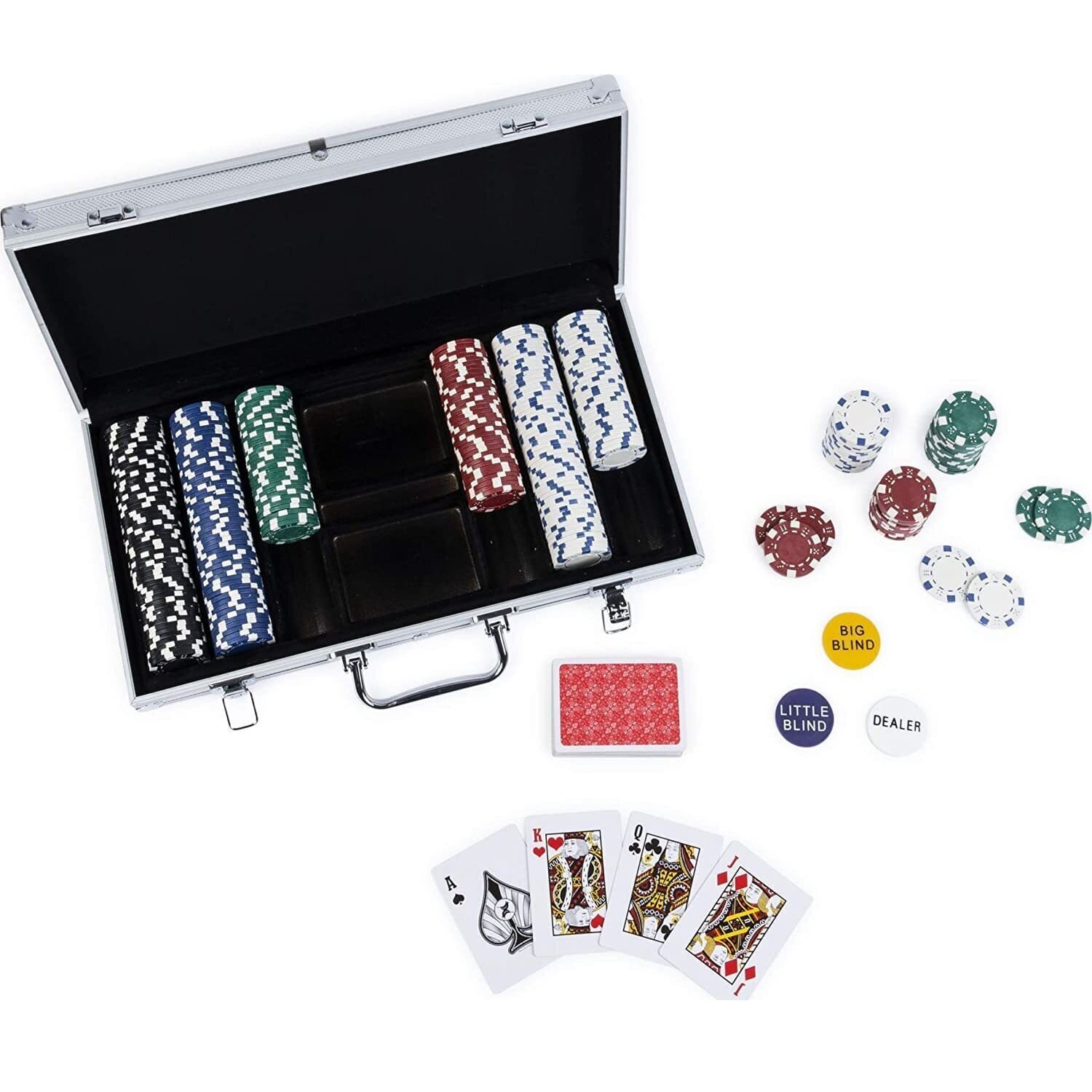 - ALL YOU NEED FOR THE PERECT POKER NIGHT: Comes with 300 casino-style chips, playing cards, dealer button, and 2 betting buttons. Also includes 5 Poker dice.