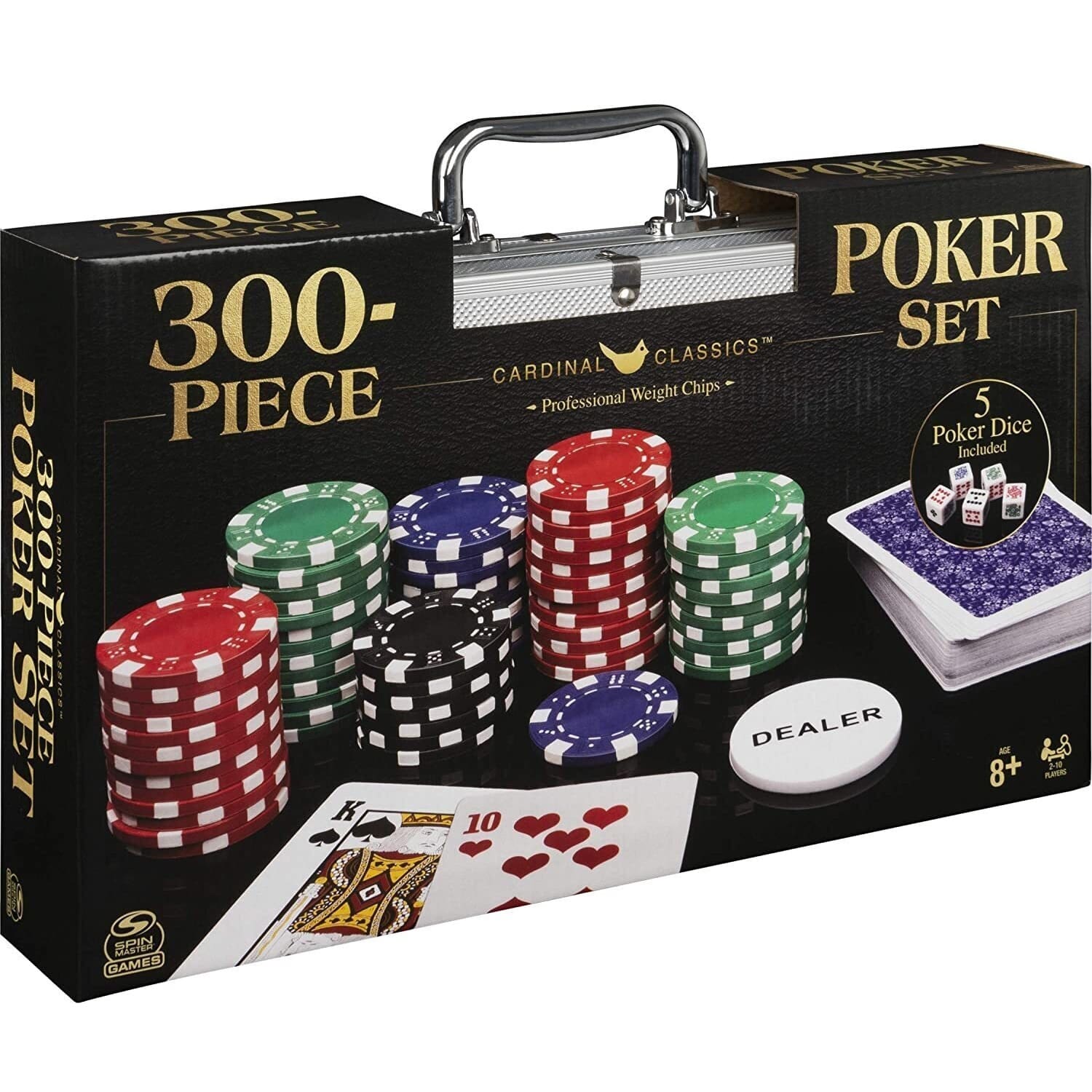 A 300 piece poker set in an aluminium metal case, including 5 poker dice, playing cards, and 300 11.5g professional weight poker chips, from Cardinal.