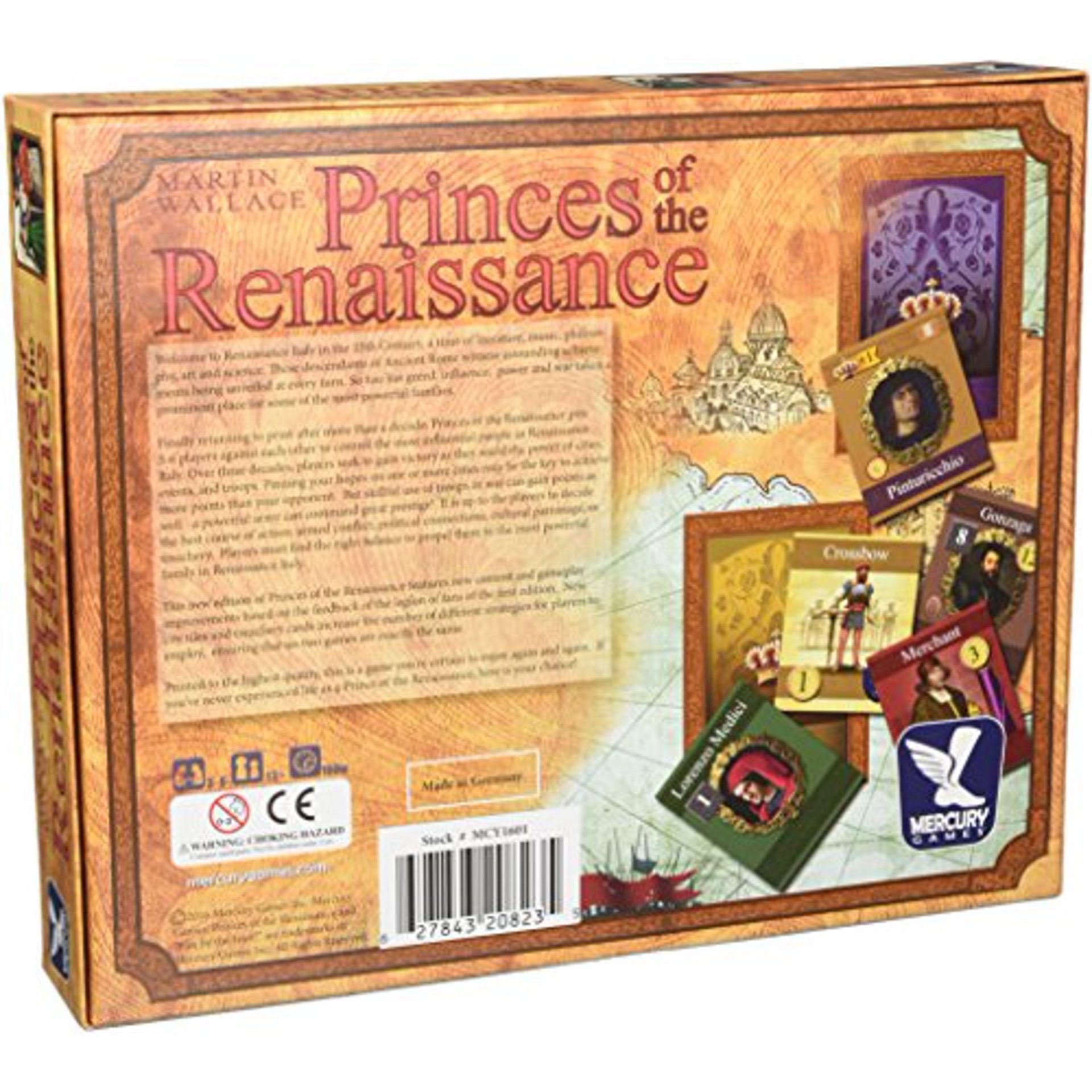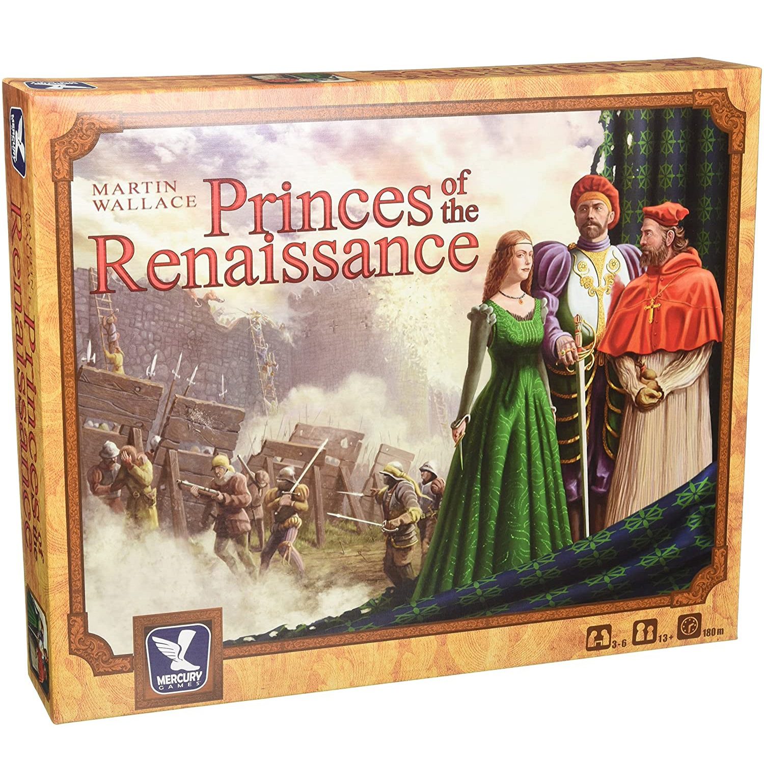 Princes of the Renaissance is set in Renaissance Italy. Each player takes on the role of one of the minor Condottiere princes, such as the Gonzagas or d’Estes. Then there are the big five major cities: Venice, Milan, Florence, Rome, and Naples. These are not controlled by individual players, but players will gain ‘interests’ in them as the game progresses. Each city has six tiles, most of which represent a famous character such as Lucrezia Borgia or Lorenzo Medici. Each tile has its own special properties that are linked to the character on the tile. Thus Cesare Borgia will help you to become more treacherous, while a Venetian merchant will increase your income. These tiles are also worth victory points, depending on the status of the city at the end of the game.