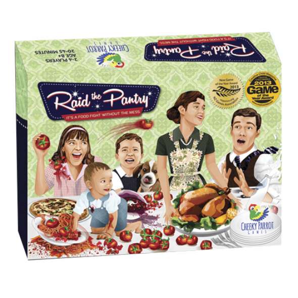 In the cooking-themed card game Raid the Pantry, for 2-4 individuals or two teams of two, players are dealt ingredient and dish cards at the start of play; over the course of the game, players need to collect the ingredients needed to make the dishes in hand. Each completed dish scores you 1-3 points, locks in its ingredients for reuse in other dishes, and allows you to take a new dish card. Action cards, drawn at the beginning of a turn, provide ways to add, lose, trade and retrieve ingredient cards. The eight “Instant Dishes” among the action cards allow players to lock in a common ingredient and score 1 point.