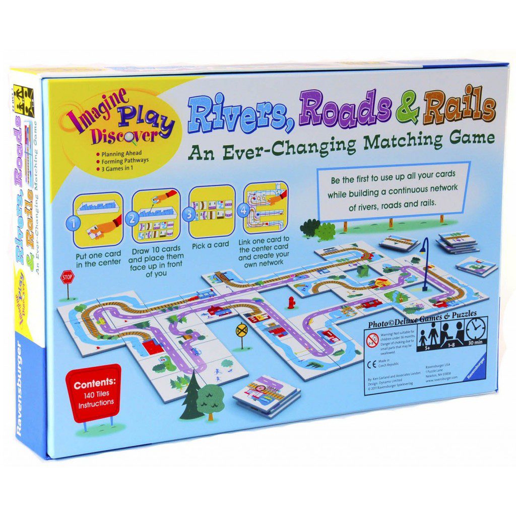 This matching game is a close relative of Dominoes. Each tile has two sides, and each side contains at most one road, one river, and one rail. You can only play a new tile adjacent to a played tile if the sides match. The act of playing tiles creates a map of an intricate twisting transportation network. The tile illustrations are very pleasing to both young and old alike. Only two of the tiles are branching, so the game is mostly played at both ends of the tiles already laid down.