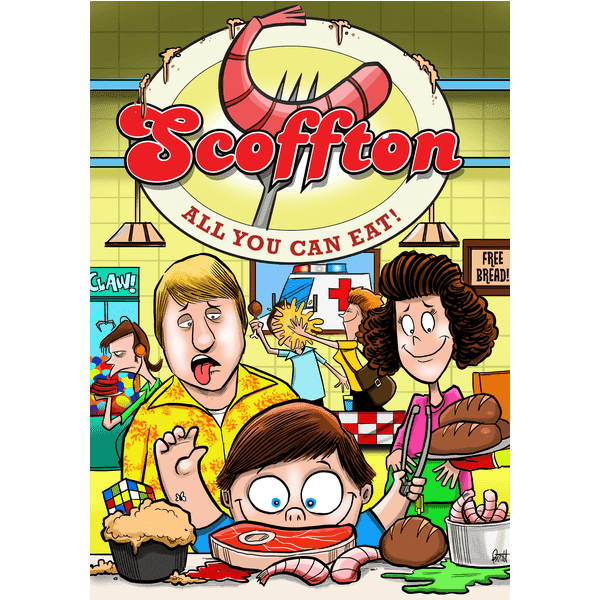Scoffton is the worker placement game of belly management that takes about 60 minutes to play and can accommodate 2-4 players, age 10+.