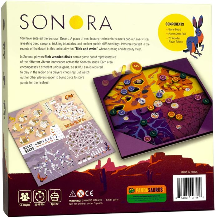 In Sonora, players flick wooden discs onto a game board representative of different vibrant landscapes across the Sonoran sands. Each area encompasses a different unique game, so skillful aim is required to play in the region of a player’s choosing and score points on your dry-erase sheet! But watch out for other players eager to bump discs to score points for themselves.