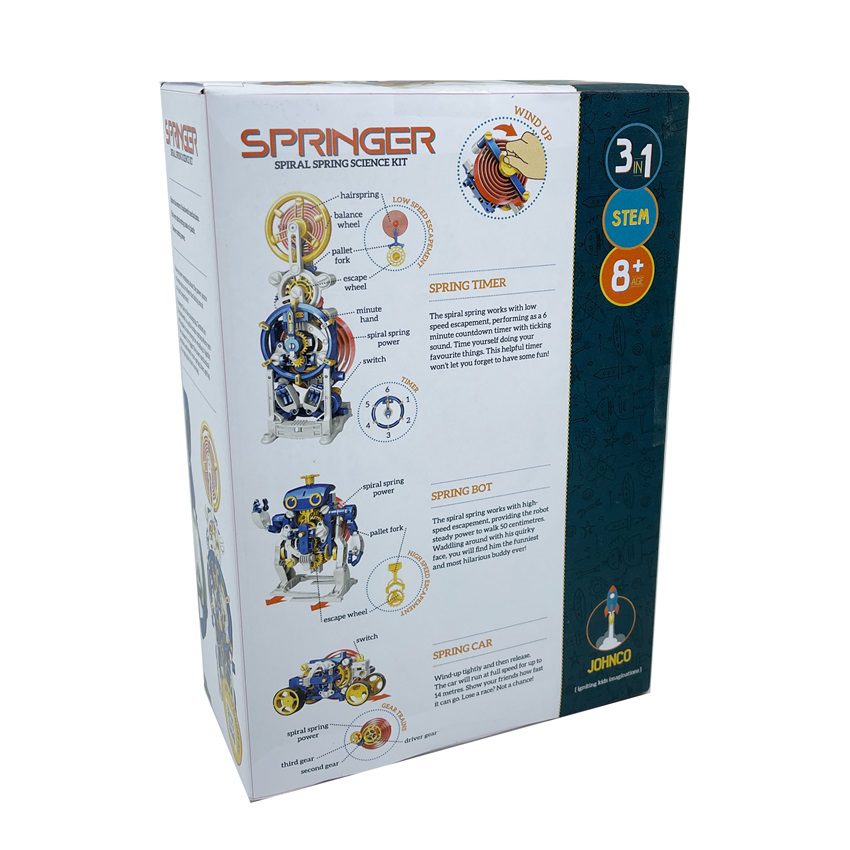 The secret lies in the mainspring. Centred on the clockwork is a spiral torsion spring where you will be able to store energy by winding it tightly. Then release it to trigger the inner mechanical operation and watch your spring timer, spring car or spring bot start moving!
