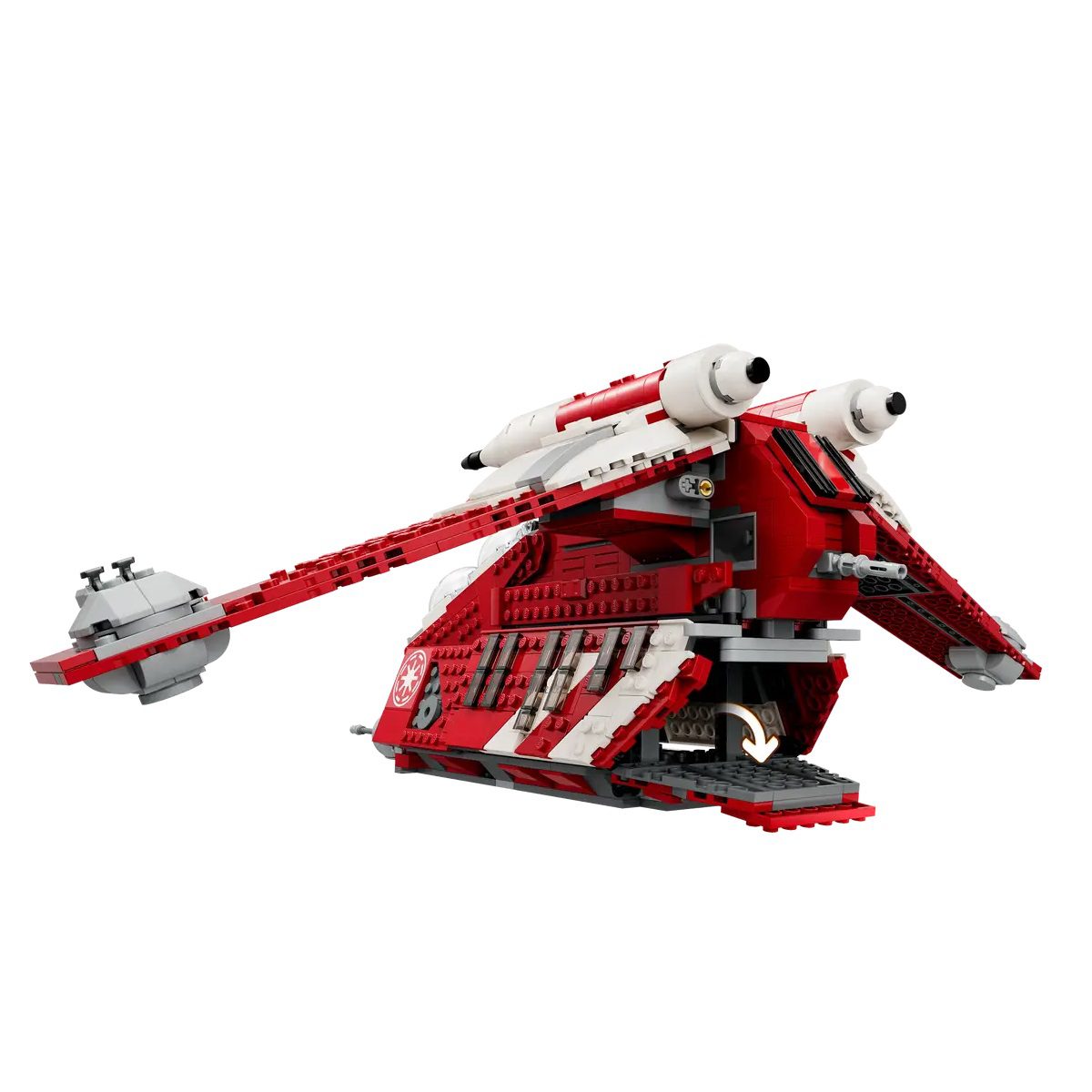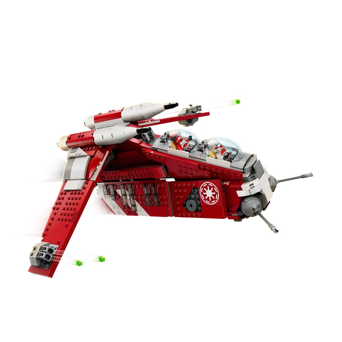 - Designed for aerial battles – The Coruscant Guard Gunship features 2 pilot cockpits, 2 stud shooters, 2 adjustable cannons and a handle for easy flying
