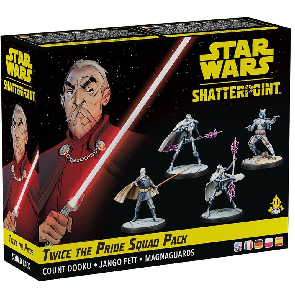 A sinister Sith Lord and his minions enter the duels of Star Wars: Shatterpoint! Once a respected Jedi Knight, and the padawan of Grand Master Yoda himself, Count Dooku has chosen the dark side, now serving as the apprentice to Darth Sidious himself. This pack adds a new squad of Count Dooku, Jango Fett, and two IG-100 MagnaGuards to Star Wars: Shatterpoint that players can use on its own or alongside other characters to create their own custom squad. In addition to the beautifully sculpted miniatures of all four characters, players will also find all the Stat, Order, and Stance cards they need to bring these characters to life on the tabletop.