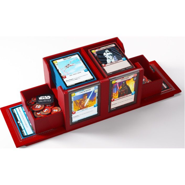 The Double Deck Pod, an officially licensed premium deck box, is specifically designed for the needs of Star Wars: Unlimited players. Unique Feature: The Double Deck Pod includes 2 Slide Card Cases with additional UV protection for keeping the leader cards. Due to the innovative placement of that cards, the stored decks can be easily identified without opening the box. The Slide Card Cases can also be detached and used during gameplay, making the Double Deck Pod the perfect 2-player-solution.