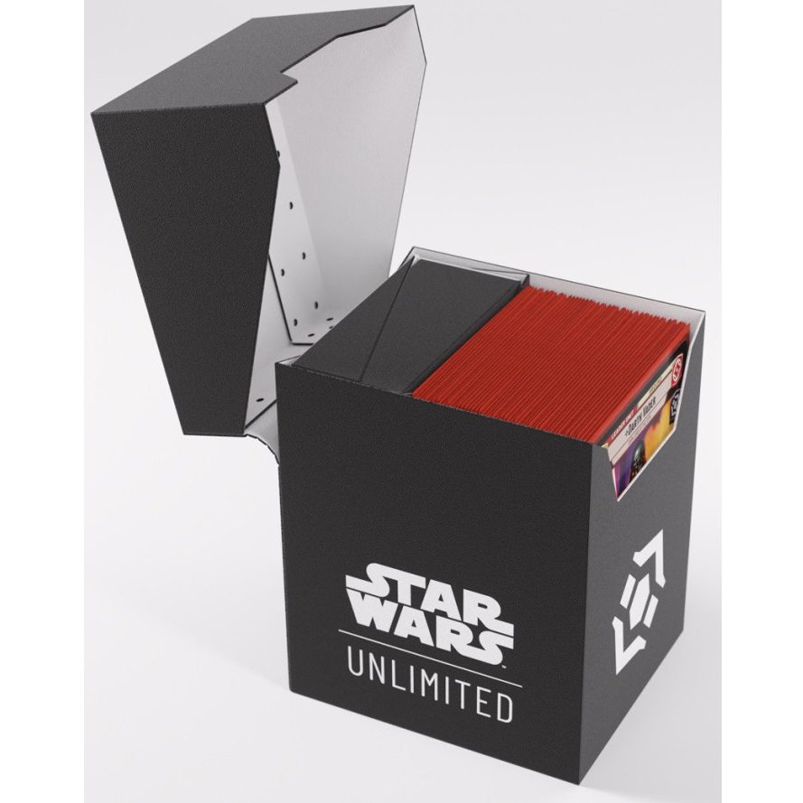 Our Star Wars: Unlimited Soft Crate is the all-in-one casual solution for Star Wars: Unlimited players. This full color printed and officially licensed deck box is packed with ingenious features. It protects a full double-sleeved deck of cards and includes an innovative token box! This token box has a smart click-lock mechanism to keep all tokens safely stored – even while pulling it out. Once opened, the lid of the box stays upright for convenient access during gameplay.