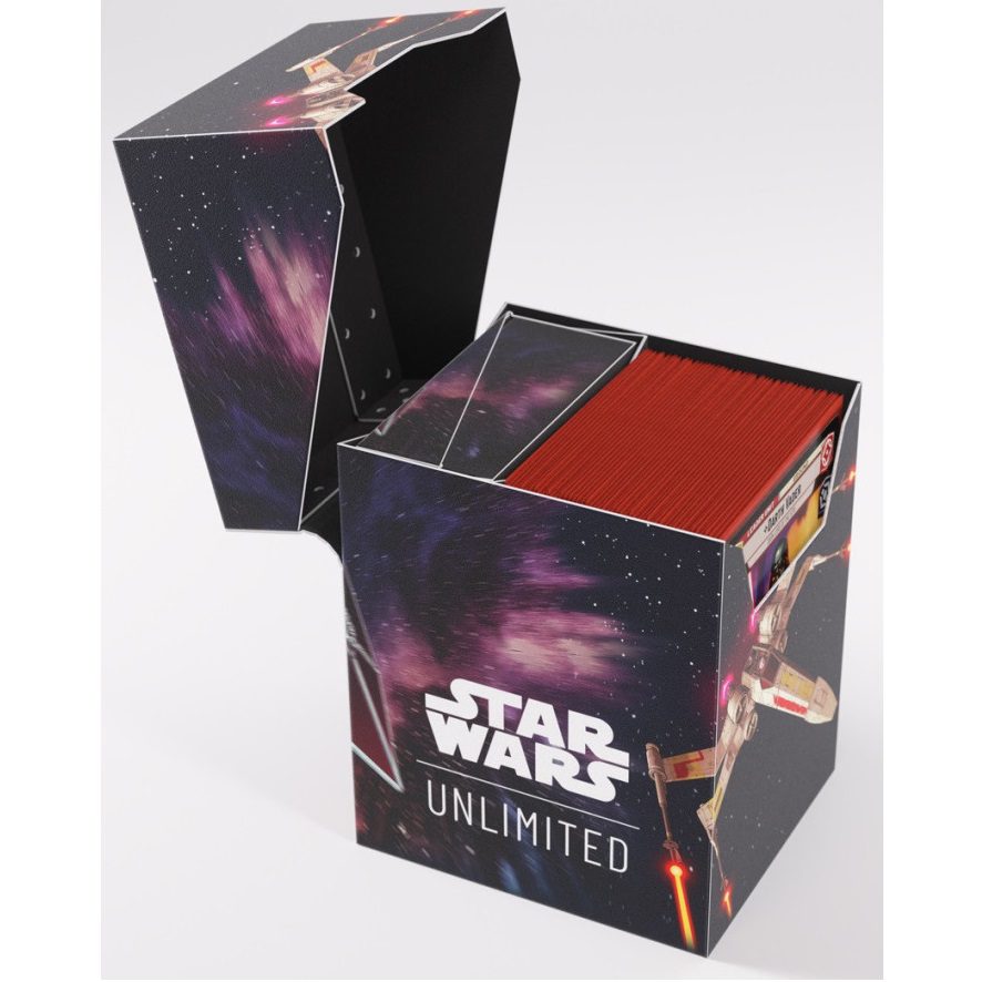 Our Star Wars: Unlimited Soft Crate is the all-in-one casual solution for Star Wars: Unlimited players. This full color printed and officially licensed deck box is packed with ingenious features. It protects a full double-sleeved deck of cards and includes an innovative token box! This token box has a smart click-lock mechanism to keep all tokens safely stored – even while pulling it out. Once opened, the lid of the box stays upright for convenient access during gameplay.
