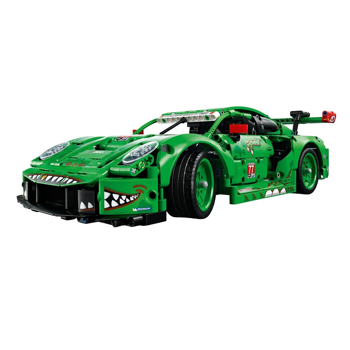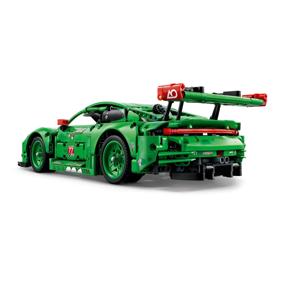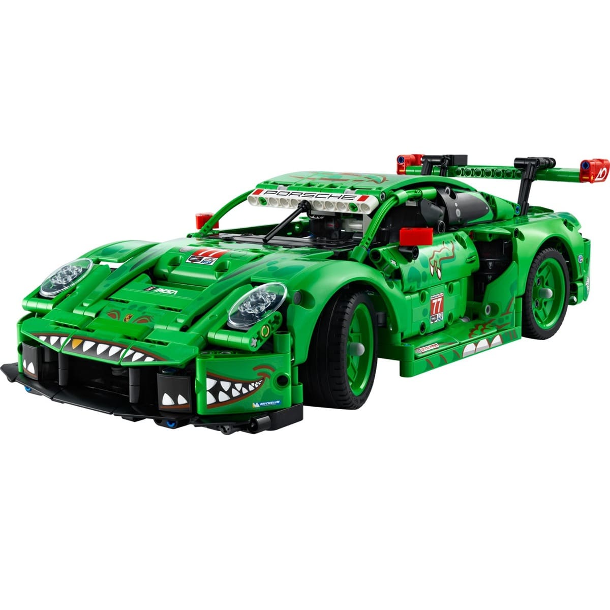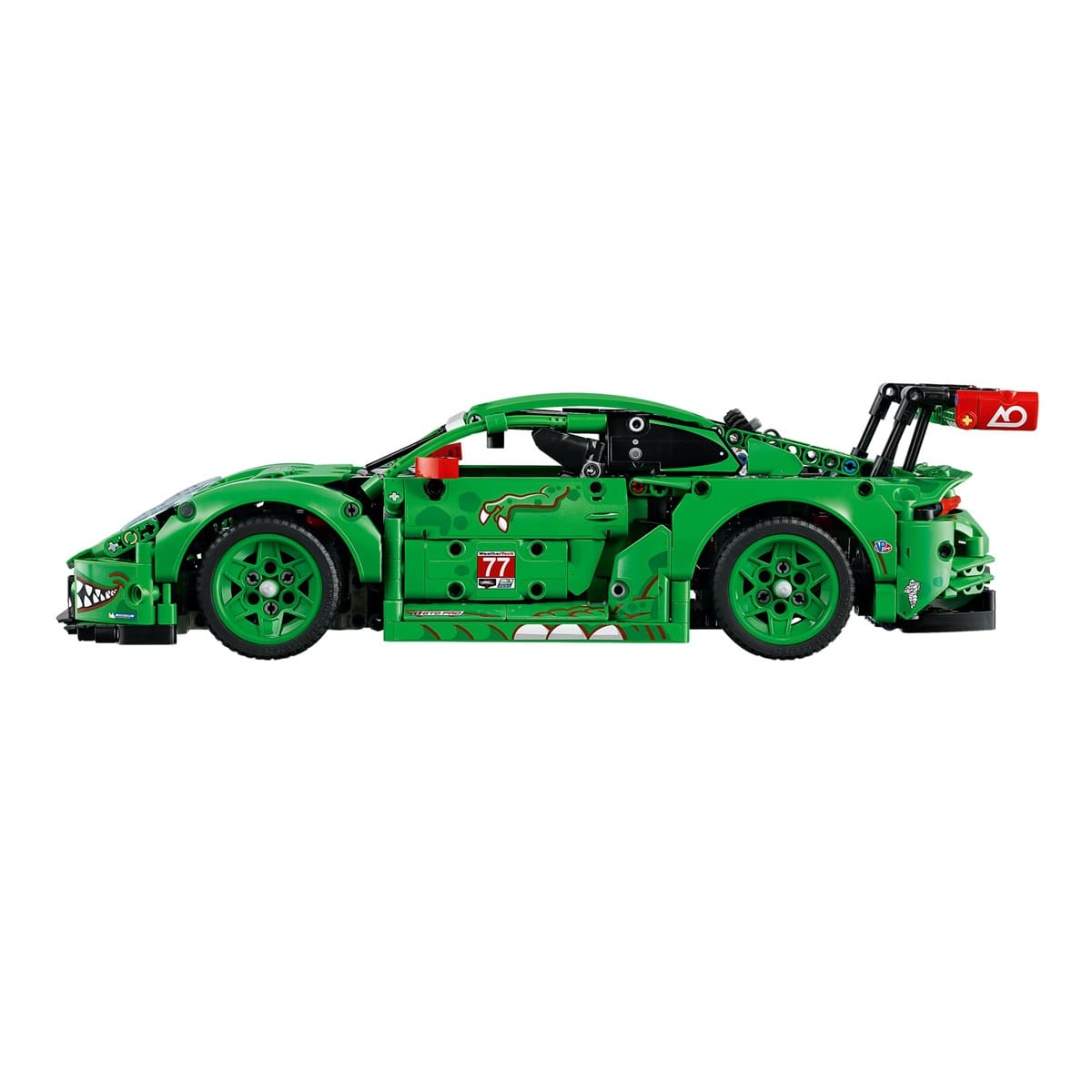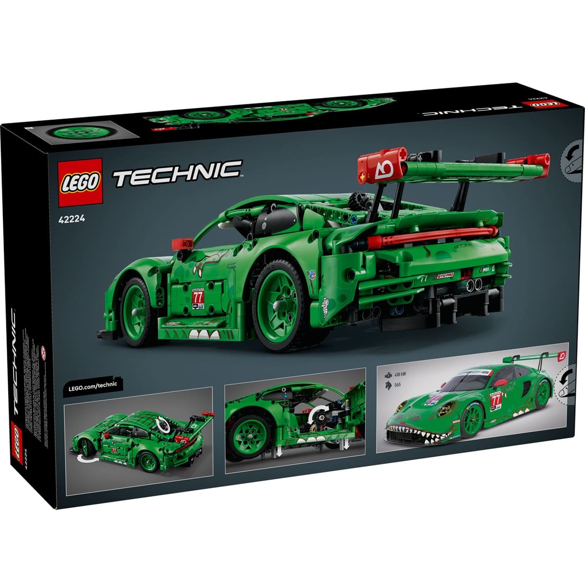 Fuel your need for speed with the LEGO® Technic™ Porsche 911 GT3 R REXY AO Racing Car (42224), a dinosaur-themed endurance race car designed for kids ages 11 and up. This high-octane build lets young builders take control with a steering knob, explore working suspension on all four wheels, a rear-wheel-drive differential, a 6-cylinder boxer engine with correct firing order, opening doors and trunk, and synchronized air jacks. The fierce T. rex-inspired livery makes this model as striking on display as it is on the racetrack.
