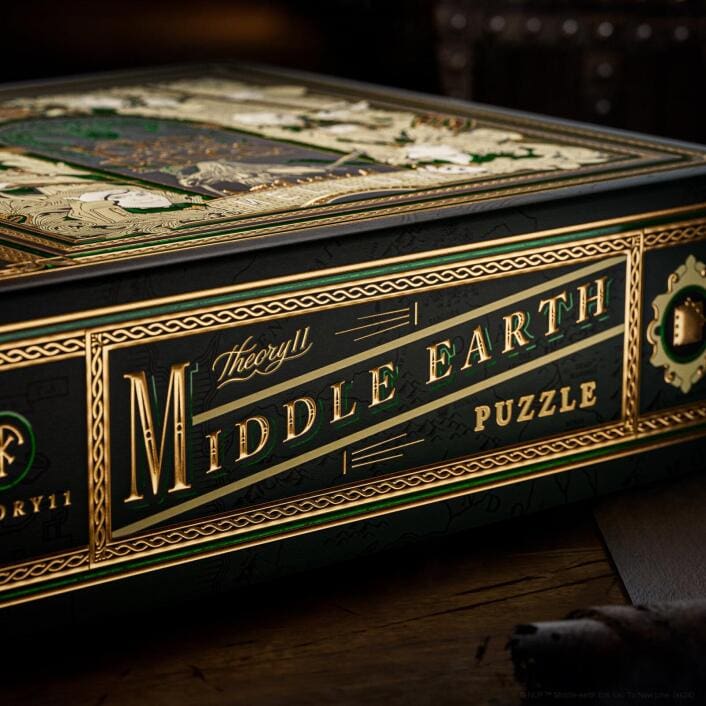 Based on custom artwork from our best-selling Lord of the Rings Playing Cards, this 1,000-piece puzzle vividly brings the beloved characters and iconic elements from the series to life. The puzzle pieces feature a striking combination of gold and green foil and come neatly packaged inside a premium carrying pouch.