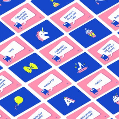 A back and forth, shouty-outy party game for two teams. Both teams have to shout out answers to the same category in turn. If a team goes blank, and can’t think of an answer in time, the other team captures the ball and wins the round. But watch out, this game comes with underdog comeback technology, so the better you do, the harder it is to win.