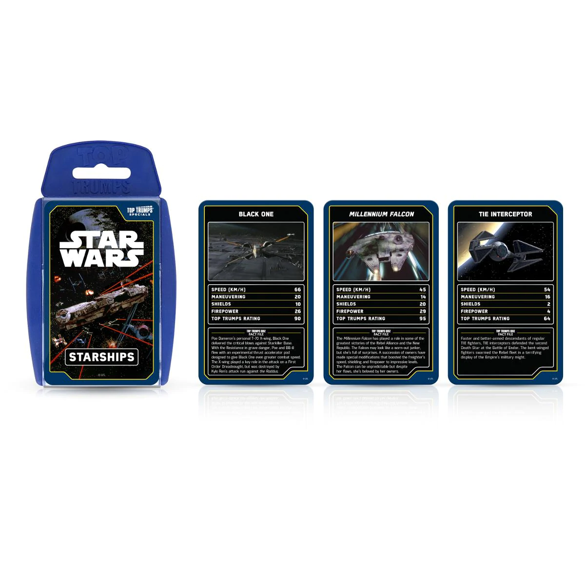 You don’t need to see identification… These are the TOP TRUMPS you’re looking for. Discover everything there is to know about some of the finest vessels in the galaxy with this exciting new edition of TOP TRUMPS: Star Wars Starships! Choose from classic and contemporary vessels from Episodes I through IX, like the Tantive IV, the Rebel X-Wing, the Imperial Star Destroyer and the Fulminatrix. With categories like speed, manoeuvring, shield and firepower, you must choose your best stat from each card and hope your opponent can’t top it; if you win the round, you get to take their card instead! Claim every card in the deck to win the match and boast the title of Top Trump. With official, detailed images of each ship and custom bios which reveal each ship’s story and significance, Sith and Jedi alike are guaranteed to find plenty to enjoy within this pack. If you’ve ever wanted to know which experimental TIE Fighter Darth Vader piloted, which vessel Queen Amidala escaped in, or which cruiser Leia Organa favoured, strap yourself in and find out!