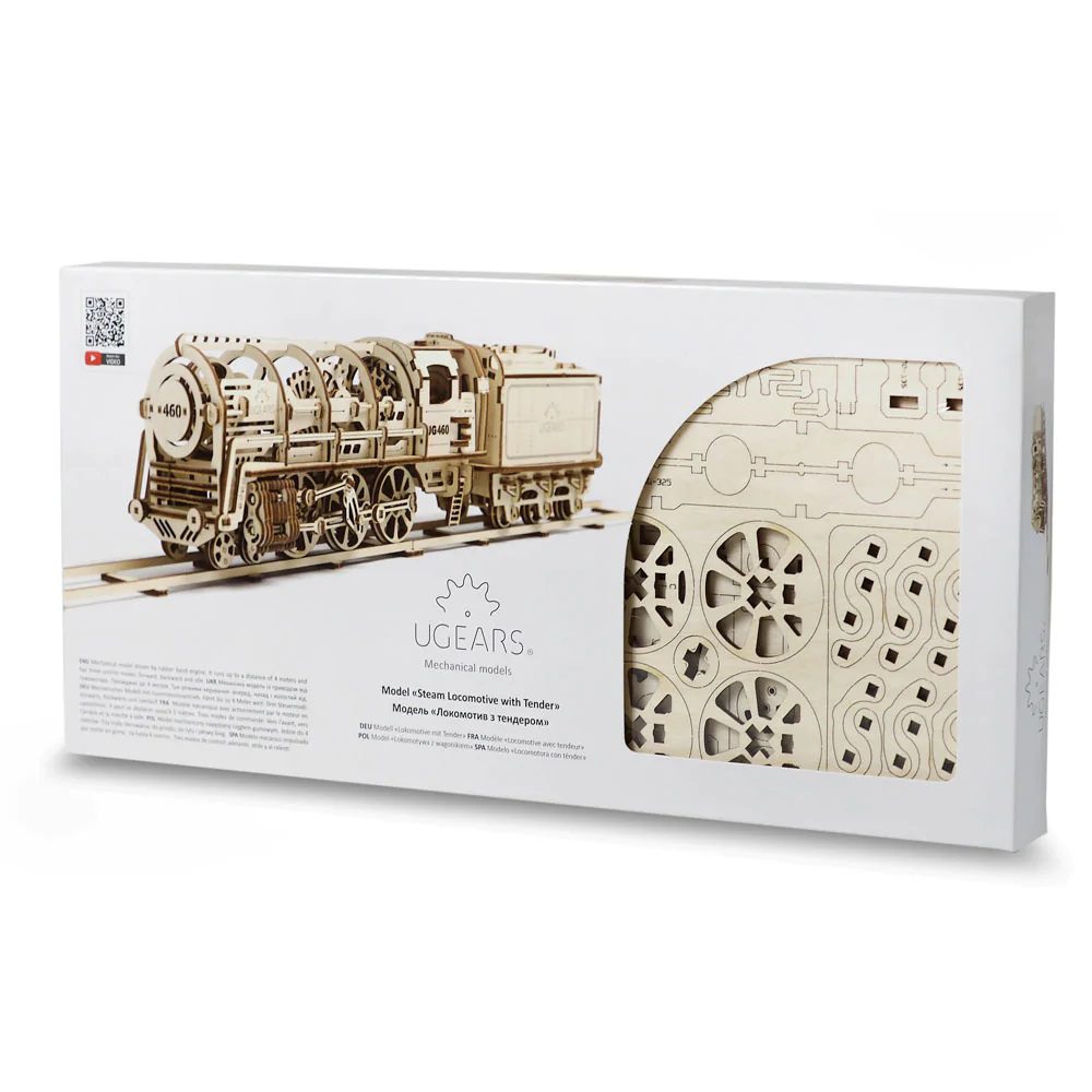 The Ugears 460 Locomotive with Tender is the most extravagant model yet, it incorporates all the technical solutions from previous model designs and more! Ugears has created this 3D puzzle with great care and perfection. It is made of attractive, high quality wooden material. All parts are pre-cut into plywood boards and are easily removed for assembly.