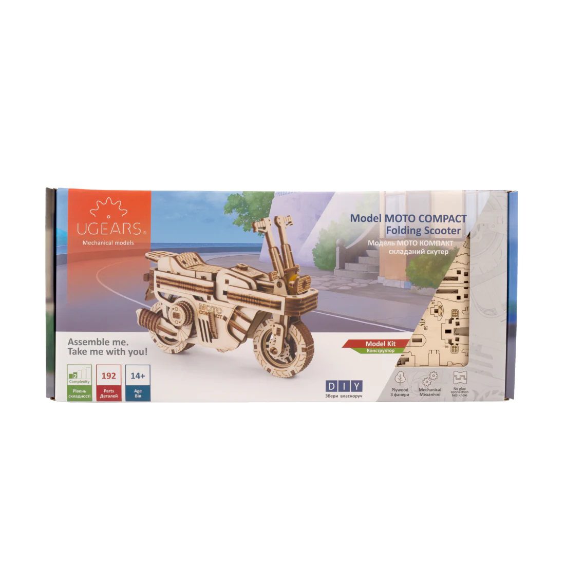 The Moto Compact folding scooter 3D puzzle packs quite a bit of power for its size. The wooden model scooter is driven by a spring-loaded engine, and is able to travel 2 m (six feet) on a single wind-up. The handle bars can be placed in one of three positions to send your Moto on a straight course, or curving to the left or right. Because this is a Ugears model, and because we delight in packing as much mechanical action as we can into our wooden DIY models, the Moto Compact comes loaded with great features, including front and rear suspension, and sophisticated folding capability for safe and easy transport.