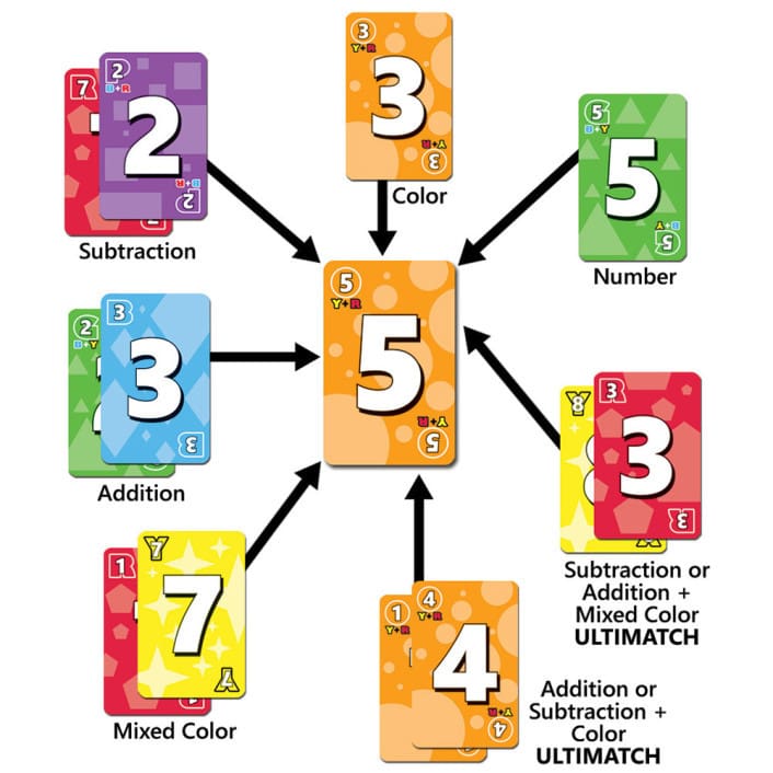 Cooperate to match cards and make your way up the pyramid as a team in this exciting, colorful, addictive game. Make clever matches by number or color. Will you use 1 card or 2? Addition or subtraction? Mix colors (yellow + blue = green)? Will you risk a card now or save it for later? Can you guess what card the other player needs? Make a perfect match of both number and color to feel the thrill and gain the rewards of an Ultimatch!
