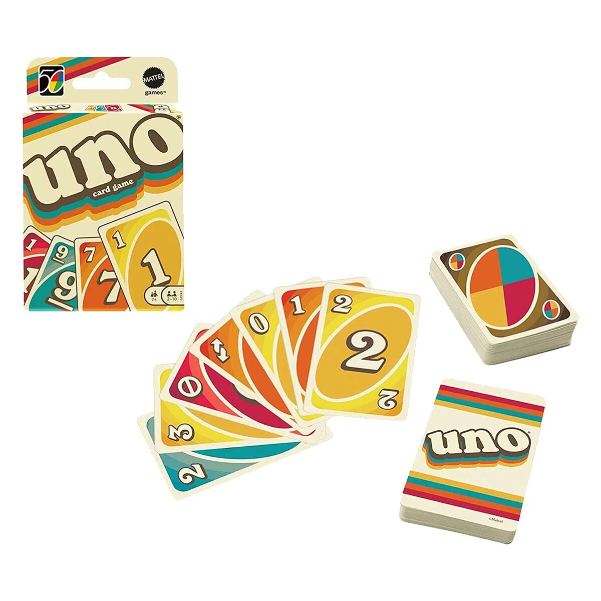 To celebrate the 50th anniversary of UNO, the classic card matching game, this deck features graphics and colours honoring the groovy 70’s decade.