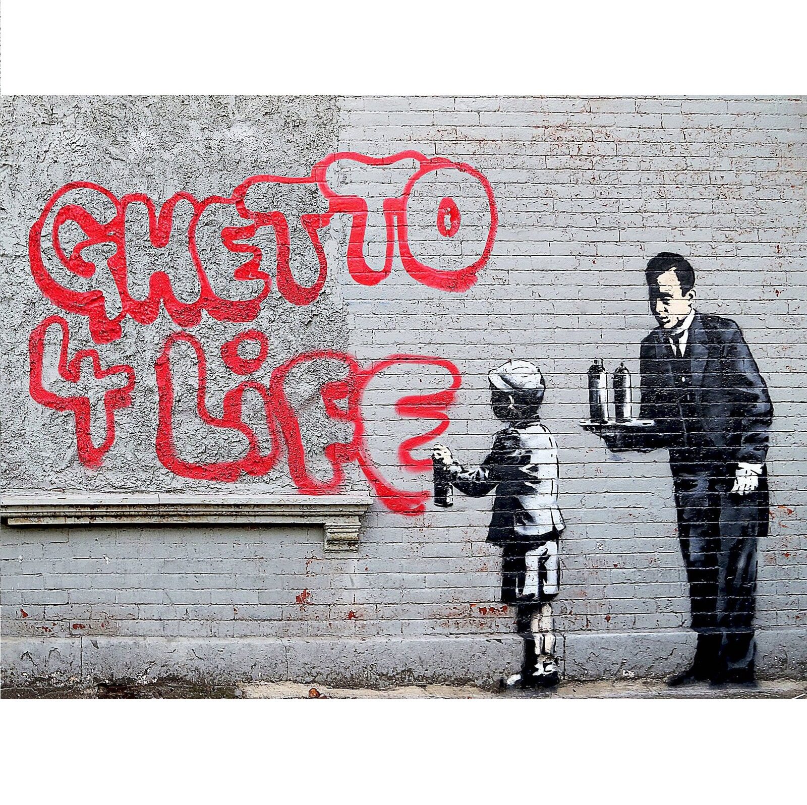 In October of 2013, Ghetto 4 Life appeared on a wall in the South Bronx during the street artist’s month-long stint in New York City. The piece depicts a young boy spray-painting the words “Ghetto 4 Life” while a butler waits on him with a silver platter of spray paint cans. The mural was highly controversial, as many residents found the message offensive and believed it to reinforce negative stereotypes.