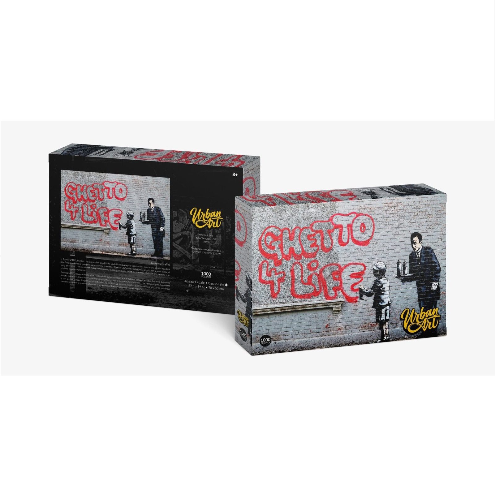 Banksy’s satirical street art and subversive epigrams combine dark humour with graffiti executed in a distinctive stenciling technique. His works of political and social commentary have appeared on streets, walls, bridges throughout the world and this 1000pc puzzle!