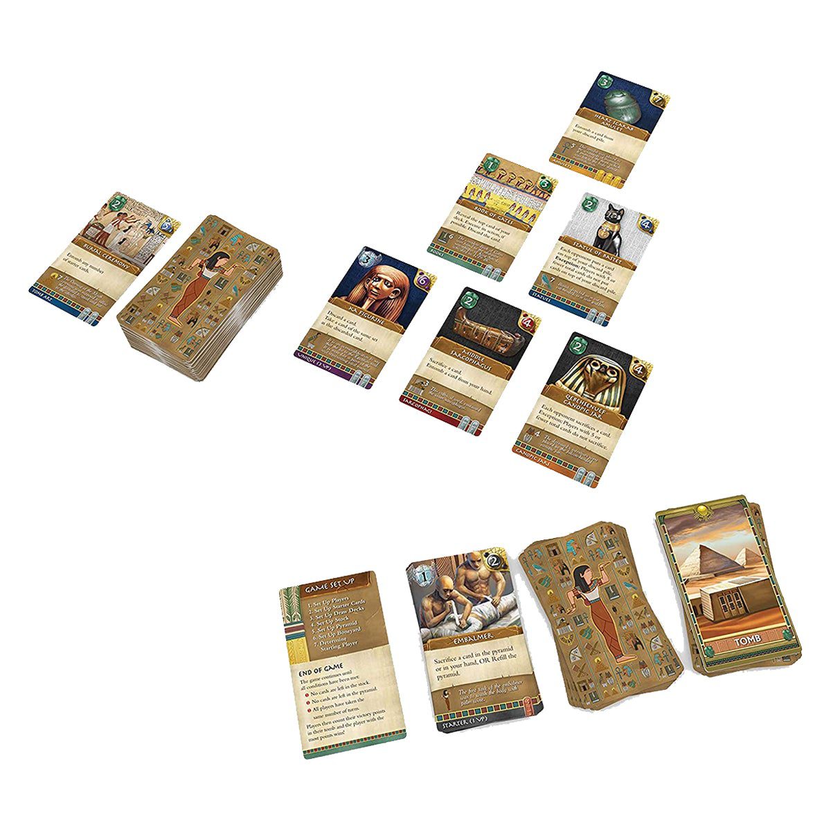 Take on the role of Egyptian nobles at the time of the pharaohs, preparing for death and burial in the Valley of the Kings. Players want to fill their tombs with food, canopic jars, statues, amulets and other treasures, and to do so they acquire cards that are laid out in the shape of a pyramid; purchase cards at the base of the pyramid, and it “crumbles” to bring cards higher in the pyramid to the base where they can be bought. The pyramid resets each round with new offerings.
