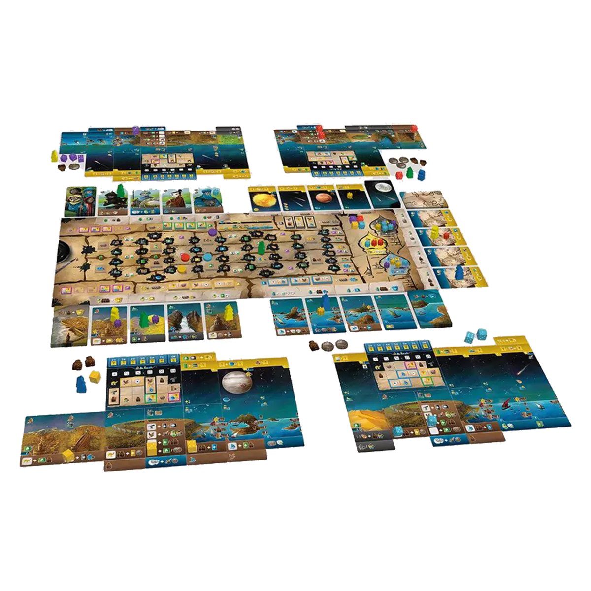 The aim of Wayfarers of the South Tigris is to be the player with the most victory points (VP) at the game’s end. Points are primarily gained by mapping the land, water, and sky. Players can also gain points from upgrading their caravans, by gaining inspiration from nobles, and by influencing the three guilds of science, trade and exploration. As they make discoveries, players will want to quickly journal their progress. The game ends once one player’s marker has reached the far right column of the journal track.
