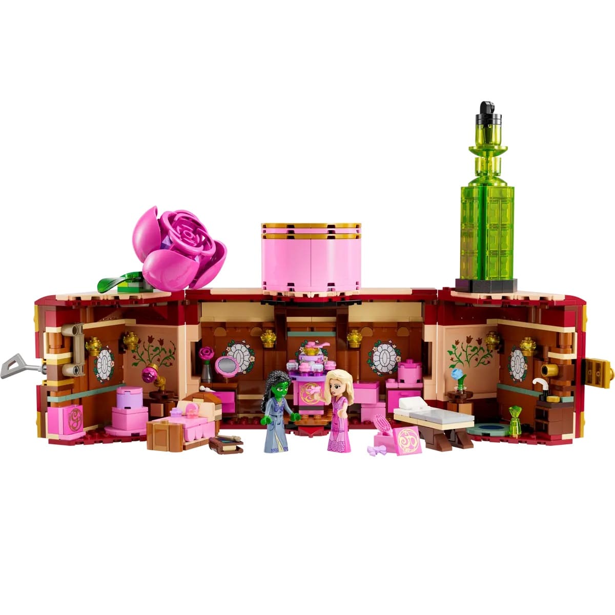 Kids scan the set’s hidden QR code to access unique LEGO® Wicked content and sing along to the “Popular” hit from the film. By placing the mini-dolls on the spinning stand, kids make the characters ‘dance’ along to the music! When the play is over, close the bedroom and transform it into Glinda’s trunk, which can be locked with a key!
