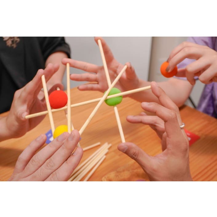 Players work together to balance sticks using precise finger placement, drawing cards to determine which finger and player must act next. For an added twist, spongey balls can be placed on the sticks—but only one per stick, and they must not touch anything else! Can your team hold up all the sticks and conquer gravity itself?
