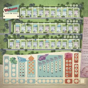 Welcome To... is a game for a bewildering one-to-one-hundred players. We take on the roles of architects, each designing towns in 1950s USA, and the game couldn’t be easier. Just give everyone one of the town sheets in the box, split the cards up into three even piles, find some pencils, and you’re already set up to play. In a game of Welcome To, we flip a card from each of the three piles, which gives us options on what we’d like to do on our turn. Each pile has a house number and a corresponding action – each player chooses the one they’d like to go for, and pencils it onto their sheet. We all take our turns simultaneously, so once everyone’s pencilled in what they want to do, we flip the next three cards and go again. Clever decisions in Welcome To are paramount. The longer the game goes the fewer options we have, so we want to balance maximising the points our town is worth with actually making sure all of it gets built. This game is a quiet puzzle where we have to make the most out of the pieces we’re given, and it’s a puzzle that I enjoy coming back to every time.